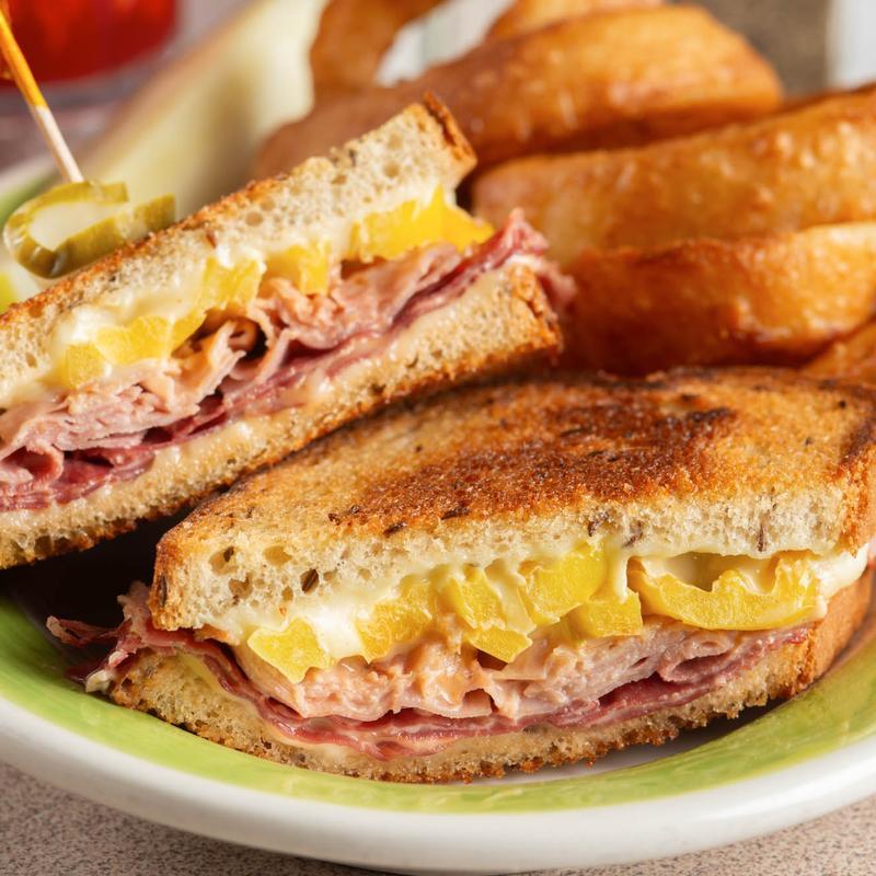 Corned beef and ham, Swiss cheese, sautéed banana peppers with Thousand Island dressing on grilled rye, served with fries.